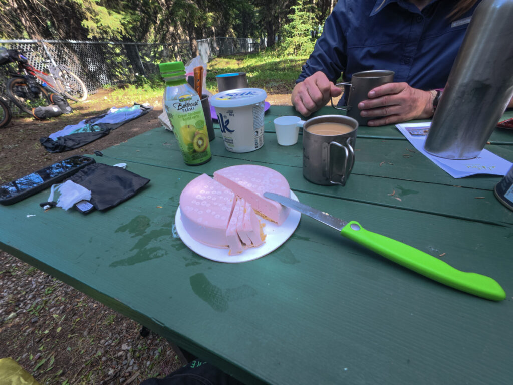 Heute hatten wir Glück mit dem Wetter! Ein super sonniger Tag, fast schon zu warm, mit Temperaturen über 25°C. Das war eine große Umstellung, nachdem wir den Tag vorher bei 6 bis 8°C im Regen geradelt waren. Unser Ziel Elkford, eine Strecke von ca. rund 40 Kilometer erwartete uns und es sollte größtenteils bergab gehen. Wir genossen die Fahrt auf einer Forststraße, die zwar ein paar Schlaglöcher hatte und an manchen Stellen matschig, aber generell gut zu befahren war. Später stellten wir uns noch einer echten Herausforderung: einer 10-prozentigen Steigung auf Schotter, die wir am Anfang der Tour sicher nicht geschafft hätten. Aber wir haben es gemeistert! Nach einem kurzen Picknick erreichten wir die ersten Anzeichen von Zivilisation: eine Teerstraße und die ersten Häuser in Elkford. Obwohl Wochenende war hatten wir wieder Glück und bekamen noch einen Platz, den wir uns mit Javier und Jared teilten, auf dem Campingplatz. So konnten wir den Betrag für den Platz aufteilen.