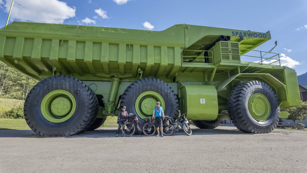 Heute geht es weiter in Richtung Fernie, eine Strecke von fast 65 Kilometern, die auch wieder einige Anstiege bereithielt. Wir kamen erst gegen 12 Uhr vom Campingplatz los und es ging gleich wieder bergauf, was auf einer Teerstraße glücklicherweise etwas einfacher war. Nachdem wir die Hauptstraße verlassen hatten, ging es auf einem Waldweg weiter. Die meisten Höhenmeter schienen wir hinter uns zu haben, denn die Strecke sollte nun eine ganze Weile bergab führen. Das machte das Fahren so viel angenehmer, besonders in der wunderschönen, einsamen Waldlandschaft. Nach einem langen Anstieg und ein paar Kilometern auf einer Forststraße, stießen wir auf einen anstrengenden Single-Trail. Mit den bepackten Fahrrädern war er einfach nicht fahrbar und so mussten wir schieben. Glücklicherweise ging es danach wieder auf eine Forststraße, die uns fast die gesamte Zeit bergab ins Tal brachte, wo wir insgesamt 400 bis 500 Meter abstiegen. Die Strecke war zwar hier und da etwas holprig, machte aber trotzdem viel Spaß. Interessant war Sparwood, wo das große, grüne Minenfahrzeug (Titan 33-19) steht, welches wohl jeder GDMBR Fahrer fotografiert.